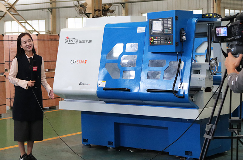 圖為主持人董迪對我廠研發(fā)的新產(chǎn)品車銑復(fù)合機床進行介紹報道